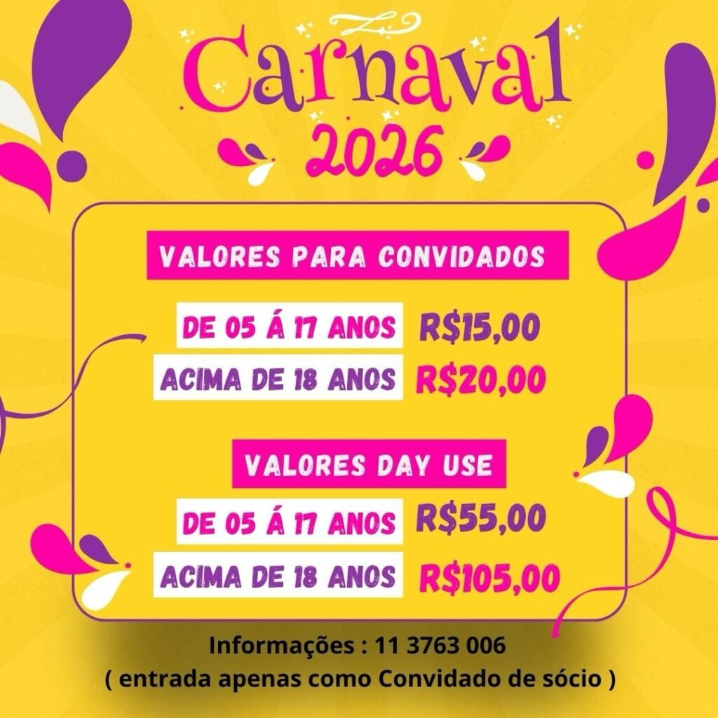 Confira a programação completa e venha sentir o Carnaval como ele deve ser: vibrante, livre e inesquecível. Chame os amigos e a família, e venha curtir mais uma de nossas programações que preparamos especialmente para você, associado!
