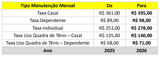 Deliberativo, o aumento das taxas mensais de manutenção a partir de Janeiro/2026,